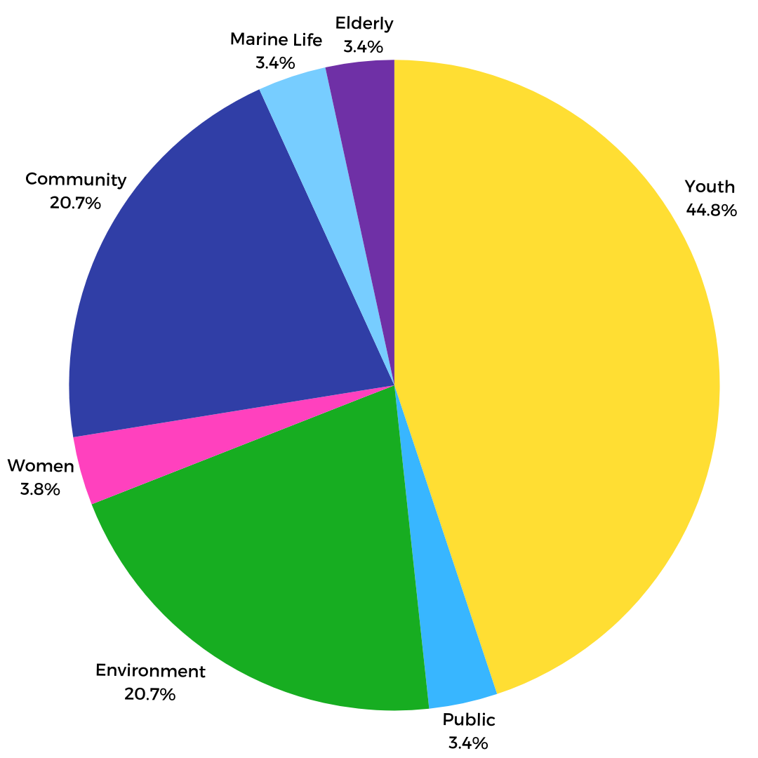 In terms of beneficiary focus, most contributions targeted youth beneficiaries (44.8%), followed by the community and environmental beneficiaries, each accounting for 20.7%. Notably, the Pemimpin GSL Leadership Programme benefited over 15,000 school leaders across 8,791 schools in Malaysia. However, YTL Power International Berhad did not disclose employee volunteer hours for FY2024.