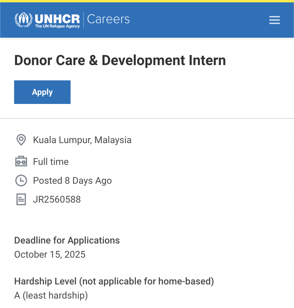UNHCR Malaysia is offering a full-time internship under its Private Sector Partnerships (PSP) service in Kuala Lumpur. The intern will support donor communication, data management, and engagement initiatives to strengthen donor loyalty and fundraising outcomes.