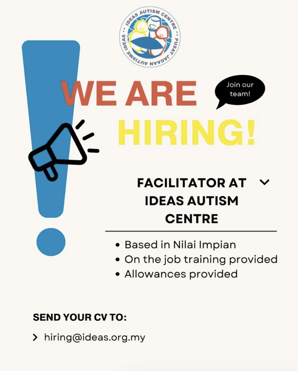 Join the team at IDEAS Autism Centre Nilai as a dedicated Facilitator and play a vital role in teaching and guiding our students towards success. This role involves adapting curriculums, creating individual learning plans, assessing progress, managing behaviour through engaging activities, and supporting students’ transitions.