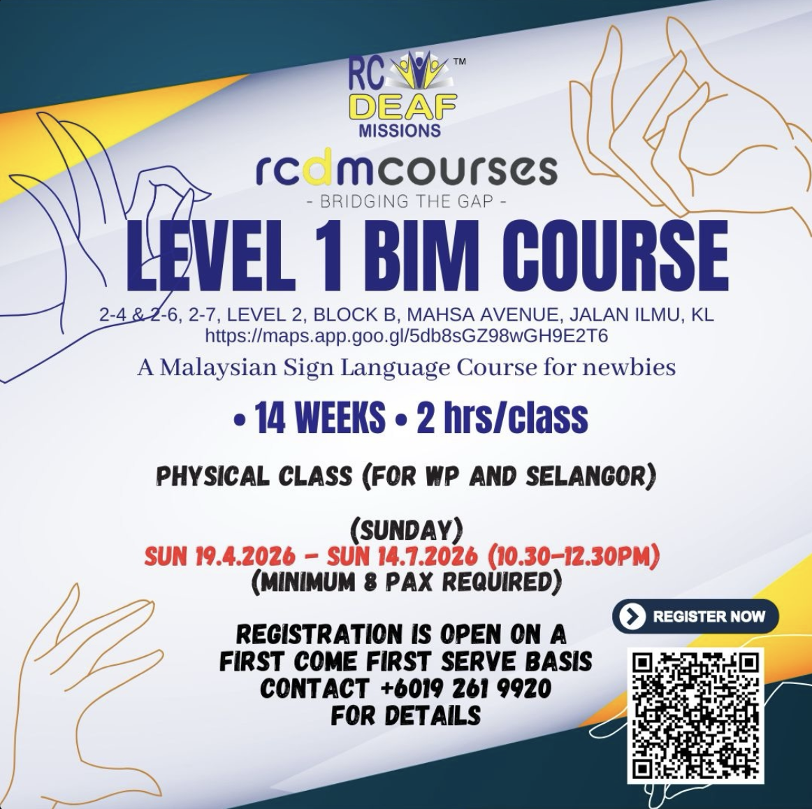 A beginner-friendly Malaysian Sign Language (BIM) course designed to help participants connect with the Deaf community. This physical class runs for 14 weeks with interactive, hands-on learning sessions held every Sunday in KL & Selangor.