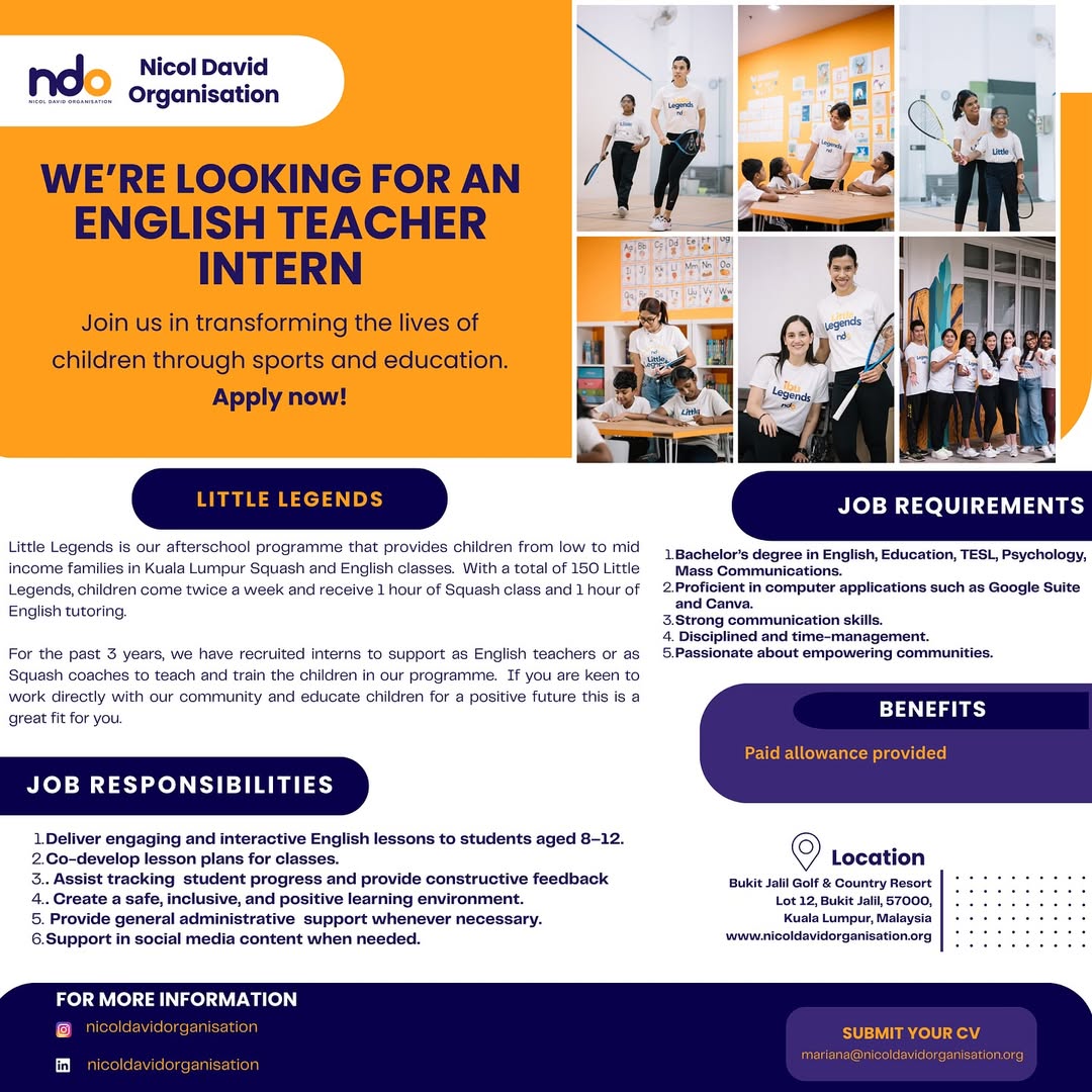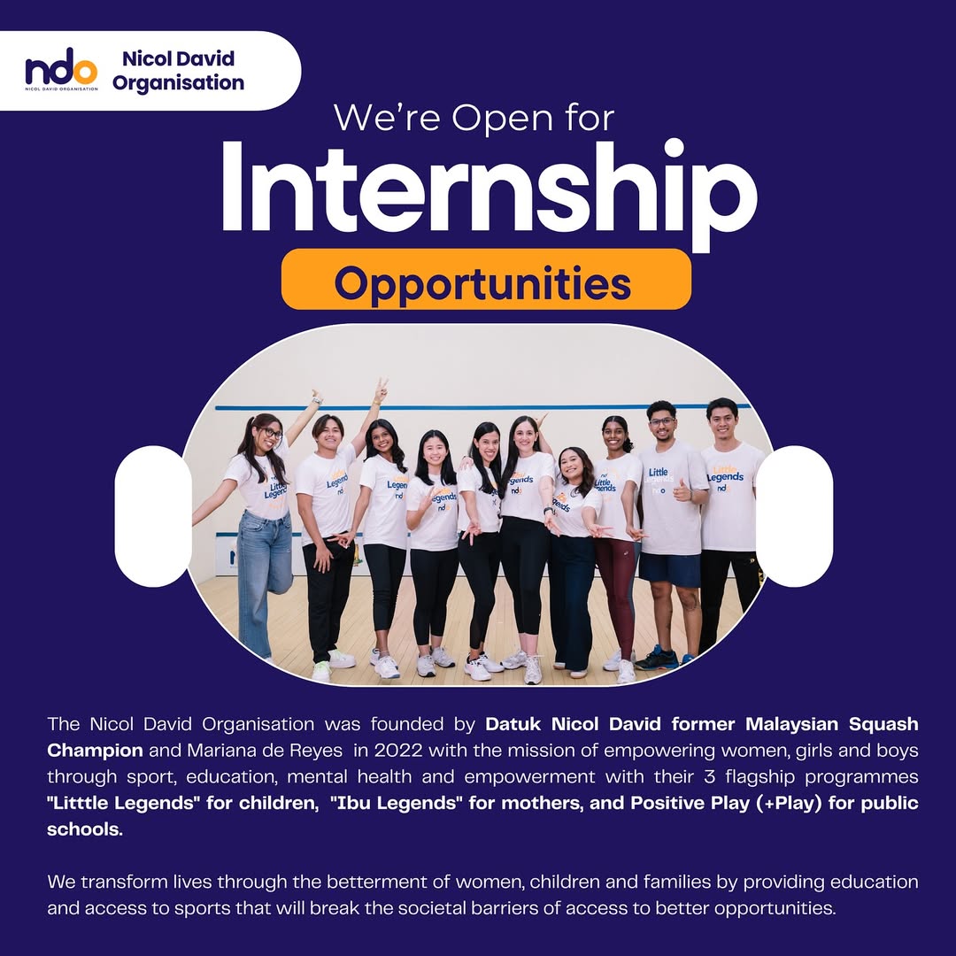 The Nicol David Organisation is looking for passionate, driven individuals to join our team as interns. This is your chance to be part of a purpose-driven organisation making real impact through sport and education.