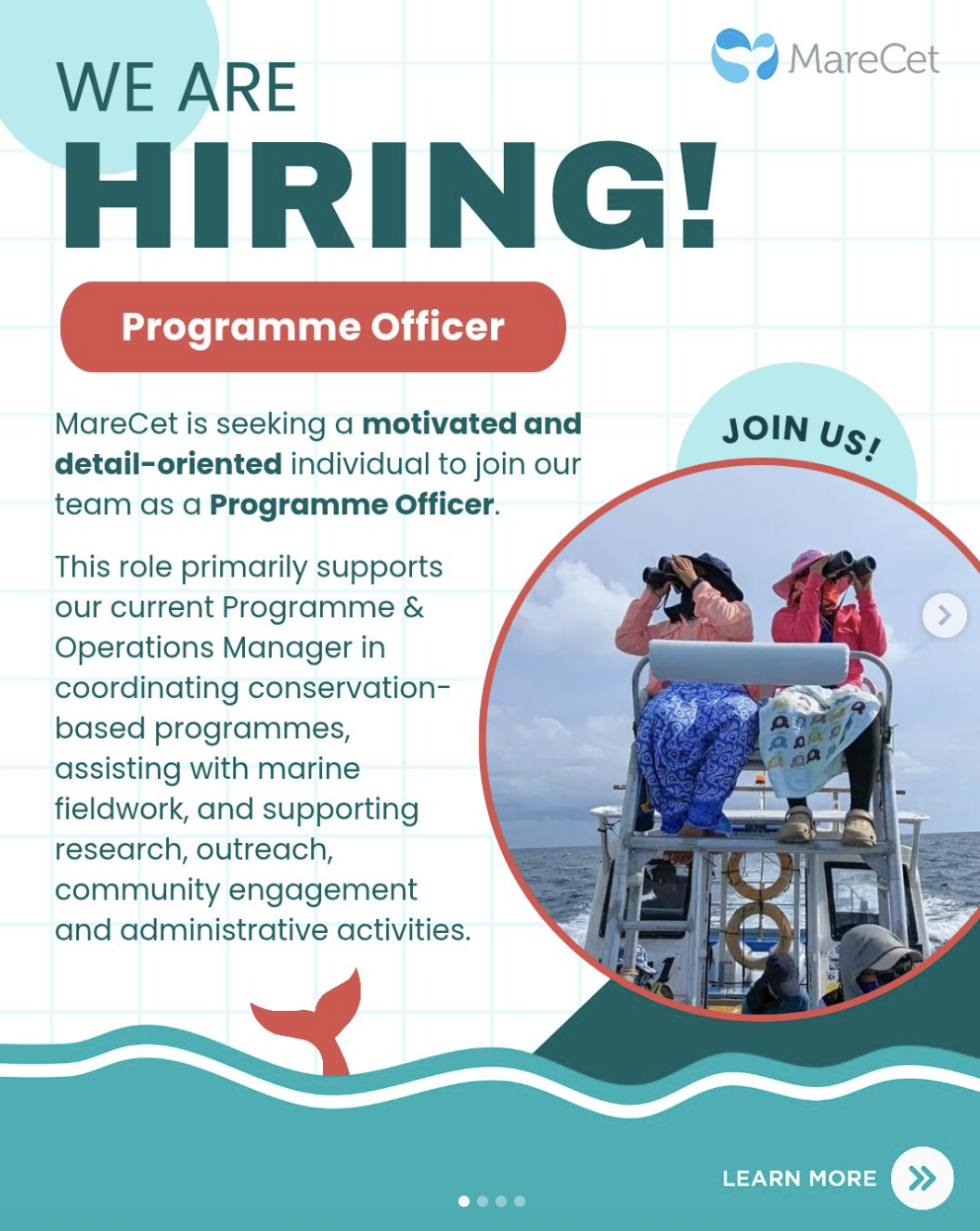 MareCet is seeking a motivated and detail-oriented individual to join the team as a Programme Officer. The role supports the Programme & Operations Manager in coordinating conservation-based programmes, assisting with marine fieldwork, and supporting research, outreach, community engagement, and administrative activities.