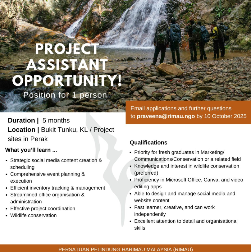 RIMAU is seeking a motivated and detail-oriented Project Assistant to join our team for a 5-month project. This role offers hands-on experience in project coordination, social media management, event planning, and wildlife conservation, with opportunities to work both in Kuala Lumpur and on-site in Perak.