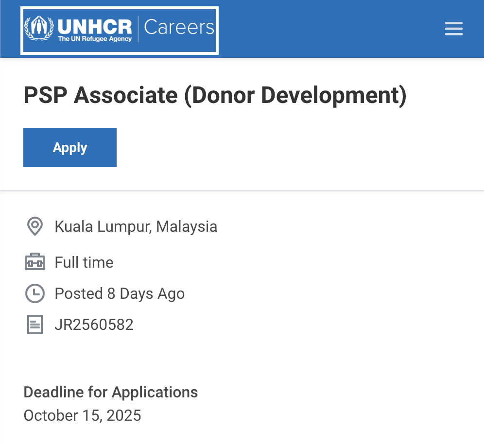 Support the Private Sector Partnerships (PSP) Malaysia team under UNHCR to engage, cultivate, and retain middle-value donors. The role focuses on personalized donor journeys, telemarketing coordination, and income growth through donor loyalty and communication.